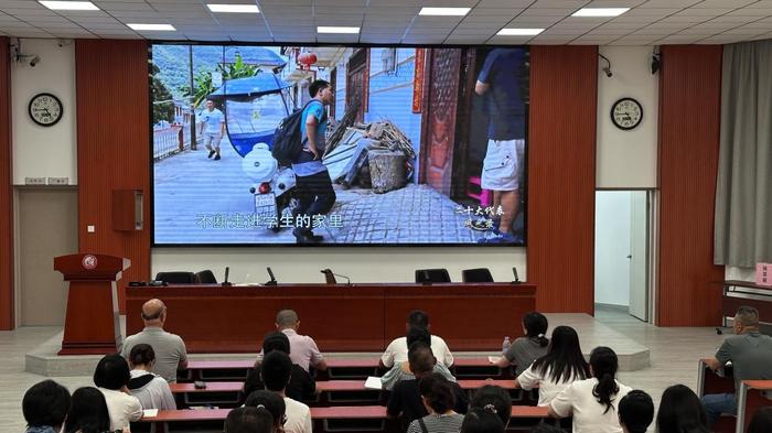 党总支书记陈敬标同志以“坚守育人初心,锤炼过硬作风——在深入贯彻中央八项规定精神中争做新时代教育先锋”为题,从“学思践悟”四个维度,为全体党员讲授“如何以中央八项规定精神为指引,锤炼过硬作风,在教育教学中彰显党员担当”。 三、 榜样引领强担当:观看党员代表刘秀祥同志先进事迹 全体党员集中观看了党的二十大代表优秀教师刘秀祥同志的先进事迹纪录片。刘秀祥同志扎根山区教育、倾心帮扶贫困学子的感人事迹和无私奉献精神深深触动了在场的每一位党员,汲取榜样力量,砥砺奋进前行。